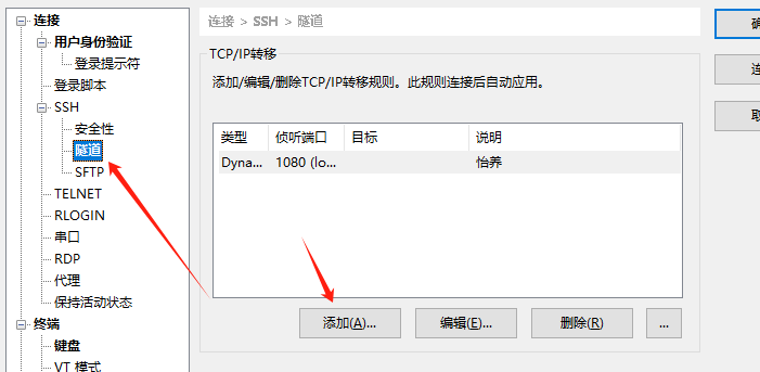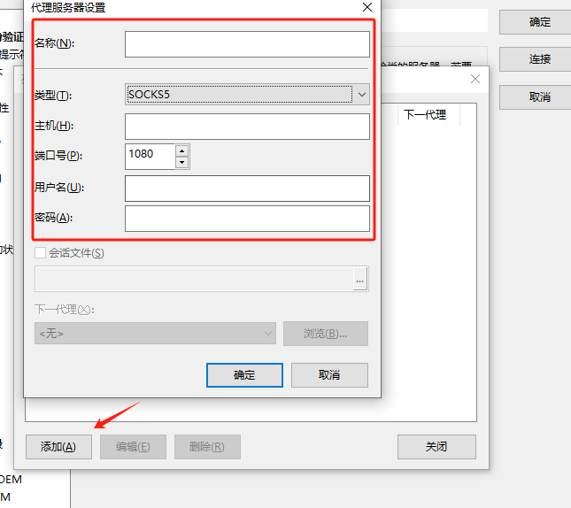 4.点击添加,在新的弹框里默认选择SOCKS5,端口1080不用更改,名称写自己想要写的,点击保存即可(跳板机在上图中的代理服务系不要选择)